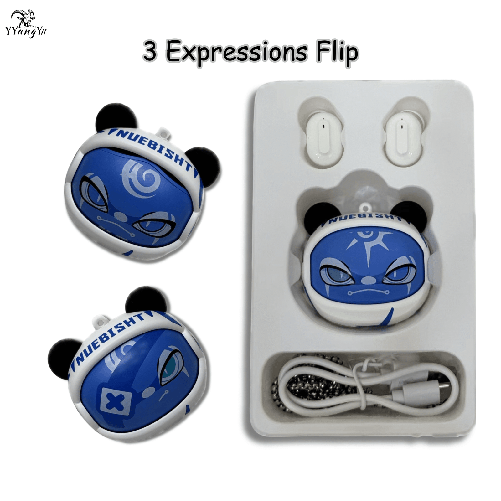 Fun flip-slide earphones with 3 cute expressions! Comes with a rope chain and wireless sound. Perfect for kids on the go.